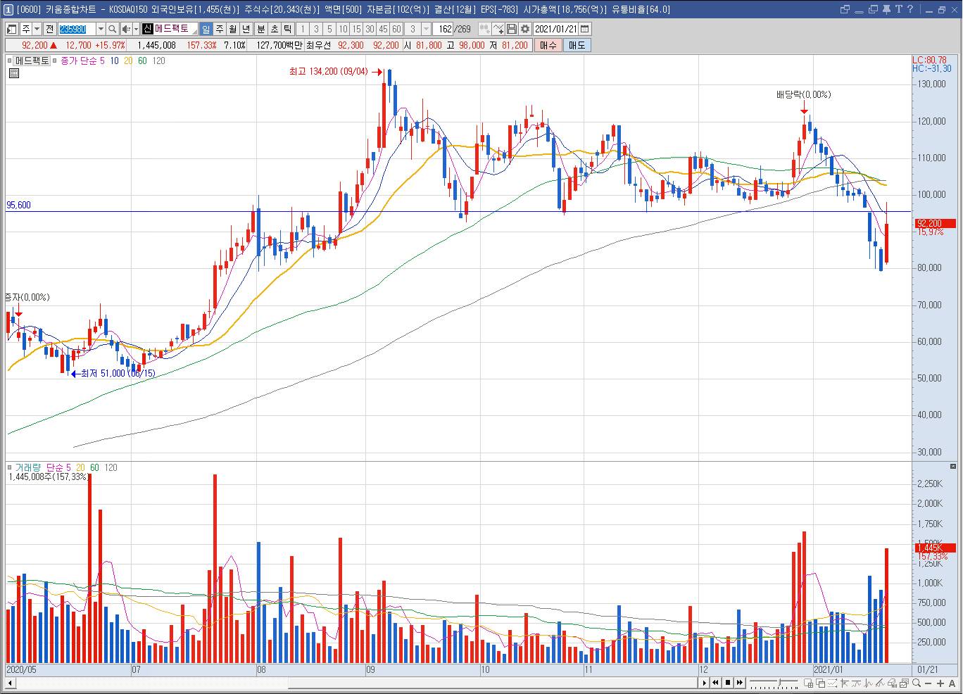 * 차트로 볼 때 메드팩토가 주가 조정 단계에 들면 21일 메드팩토 시가 기준으로 접근하면 됨. (시가 언저리 매수 타이밍을 노리라는 이야기)